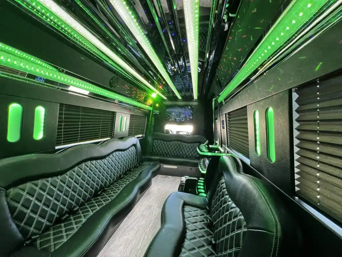 For those who desire an ultra-private and sophisticated ride, the BLACKCAR Luxe 13 is the ultimate choice. As part of our Party Bus Rental Miami service, this Mercedes-Benz Sprinter is transformed into a mobile VIP lounge, featuring premium leather captain’s chairs, a fiber-optic star ceiling, high-end surround sound, mini bar, and blackout privacy windows. It’s designed for executive transport, celebrity clientele, and luxury nightlife travel.